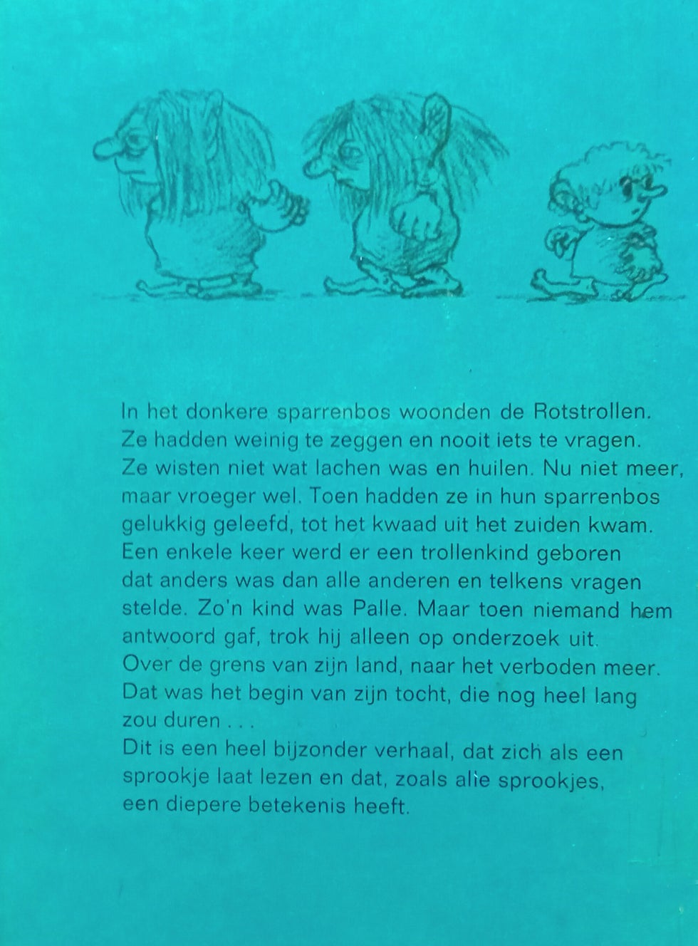 In het donkere sparrenbos woonden de Rotstrollen. Ze hadden weinig te zeggen en nooit iets te vragen. Ze wisten niet wat lachen was en huilen. Nu niet meer, maar vroeger wel. Toen hadden ze in het sparrenbos gelukkig geleefd, tot het kwaad uit het zuiden kwam. Een enkele keer werd er een trollenkind geboren dat anders was dan alle anderen en telkens vragen stelde. Zo'n kind was Palle. Maar toen niemand hem antwoord gaf, trok hij alleen op onderzoek uit. Over de grens van zijn land, naar het verboden meer. Dat was het begin van zijn tocht, die nog heel lang zou duren... Dit is een heel bijzonder verhaal, dat zich als een sprookje laat lezen en dat, zoals alle sprookjes, een diepere betekenis heeft.